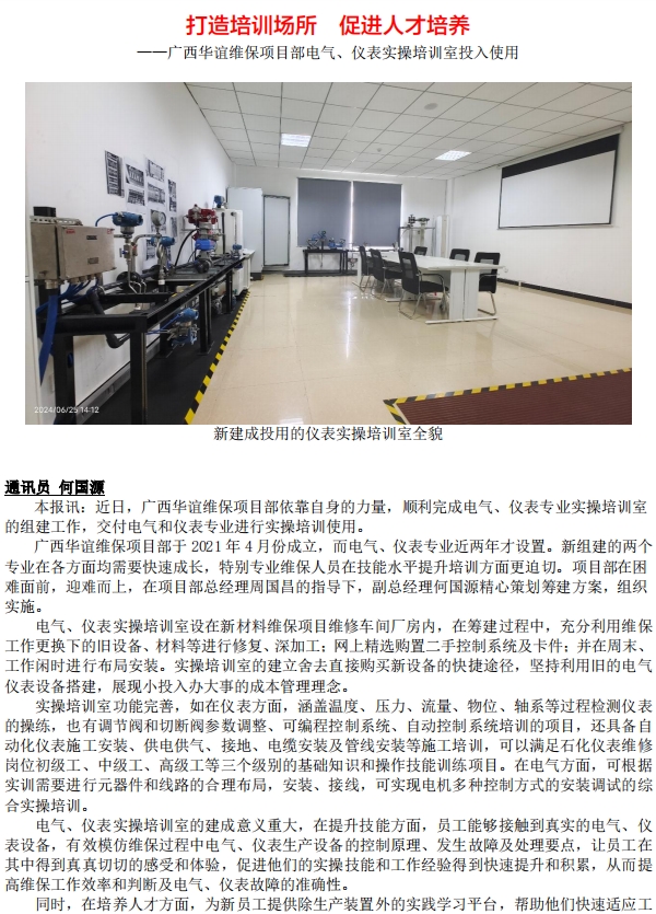 廣西華誼維保項目部電氣、儀表實操培訓室投入使用